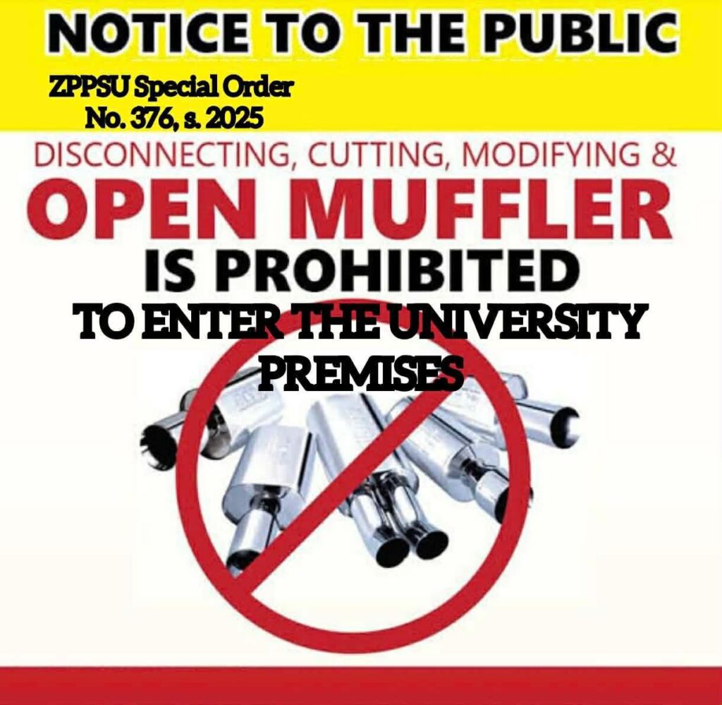 To all students, faculty, admin, and staff, all motorcycles with noisy or modified mufflers are hereby prohibited from entering the university premises. Such vehicles violate existing campus regulations and compromise the institution’s commitment to maintaining a conducive learning environment. Regardless of ownership, these vehicles shall not be allowed entry into the campus.